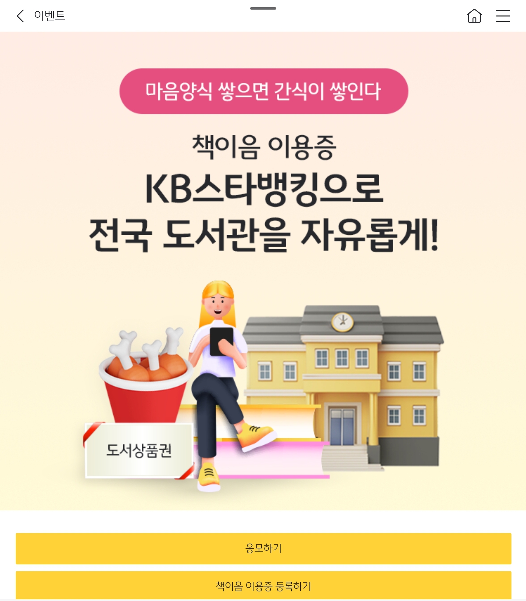 KB 국민은행이 KB스타뱅킹 내 '책이음 서비스' 시행을 기념하여 이벤트중입니다.